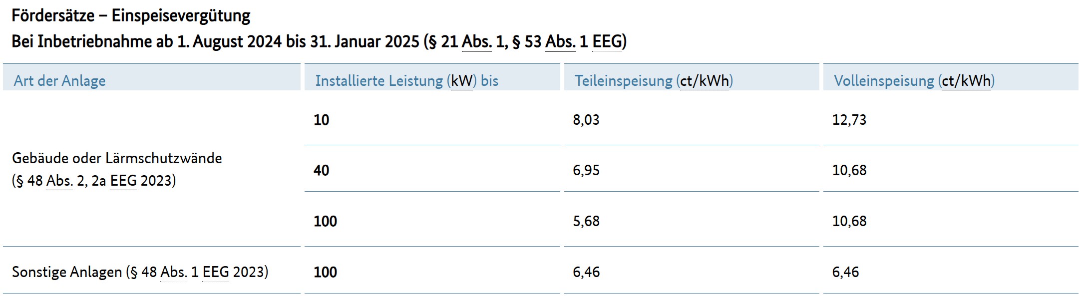 Eine aktuelle Übersicht der Einspeisevergütungssätze für 2025 finden Sie beispielsweise auf folgenden Seiten: