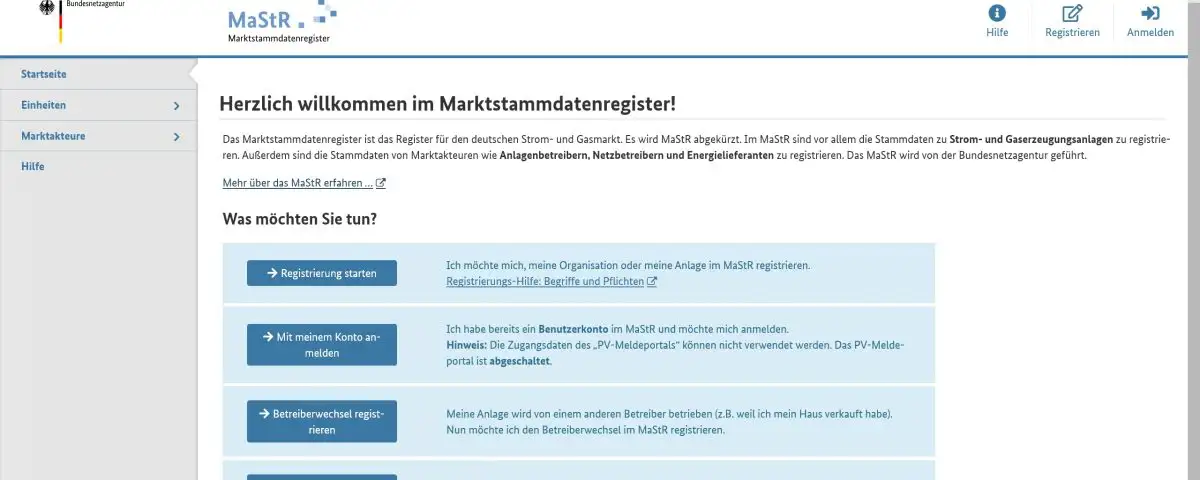 Bisher mussten alles PV-Anlagen bei der Bundesnetzagentur angemeldet werden. Das neue Marktstammdatenregister (MaStR) löst seit 02-2019 alle bisherigen Meldewege für PV-Anlagen nach dem Erneuerbare‑Energien‑Gesetz ab.